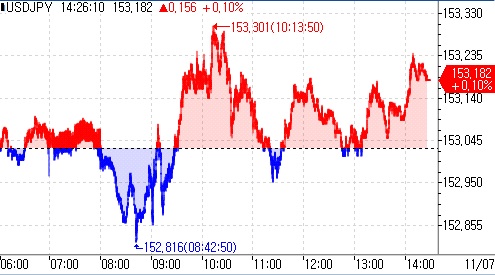 오후 2시 26분 현재 달러-엔 환율은 전장보다 0.10% 오른 153.182엔에 거래됐다.