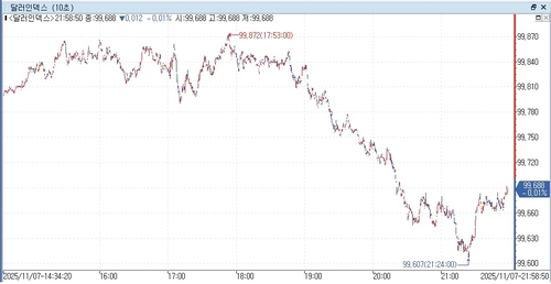 연합인포맥스(화면번호 6411)에 따르면 7일 오전 9시 1분 현재(이하 미 동부시간) 뉴욕 외환시장에서 주요 6개 통화에 대한 달러 가치를 반영하는 달러인덱스(DXY)는 99.688로 전장 마감 가격(99.700)보다 0.012포인트(0.012%) 내려갔다.