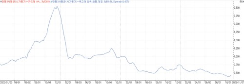 연합인포맥스 (화면번호 4748번)에 따르면 만기 3년 기준 국고채 대비 카드채(AA-) 크레디트 스프레드는 38.5bp다. 금리 인상 기조를 종료한 2023년 1월(1천687bp)부터 꾸준히 축소해 연초 50bp대에서 전월 30bp까지 좁혀진 후 다시 벌어지고 있다.
