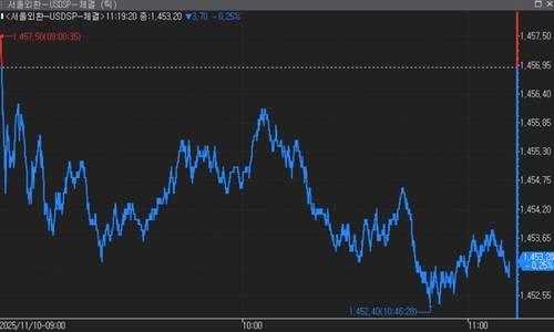 10일 서울 외환시장에서 달러-원 환율은 오전 11시19분 현재 전장대비 3.70원 내린 1,453.20원에 거래됐다.