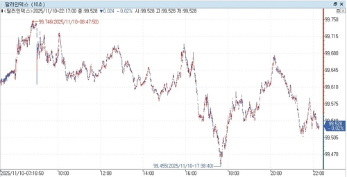 연합인포맥스(화면번호 6411)에 따르면 10일 오전 8시 16분 현재(이하 미 동부시간) 뉴욕 외환시장에서 주요 6개 통화에 대한 달러 가치를 반영하는 달러인덱스(DXY)는 99.524로 전장 마감 가격(99.551)보다 0.027인트(0.027%) 내려갔다.
