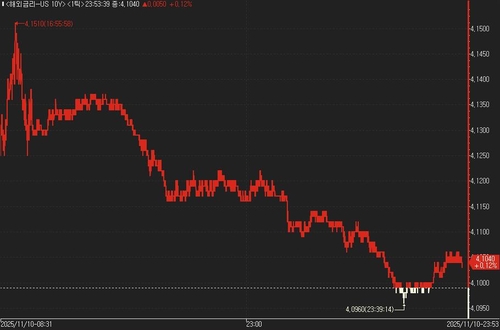 연합인포맥스의 해외금리 일중 화면(화면번호 6532)에 따르면 10일(미국 동부시간) 오전 9시 7분 현재 뉴욕 채권시장에서 10년물 국채금리는 직전 거래일 오후 3시 기준가보다 1.70bp 오른 4.110%를 기록했다.