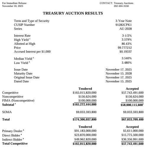 미국 재무부는 10일(현지시간) 입찰을 실시한 뒤 580억달러 규모 3년물 국채의 발행 수익률이 3.579%로 결정됐다고 발표했다. 지난달 입찰 때의 3.576%에 비해 0.3bp 높아졌다.