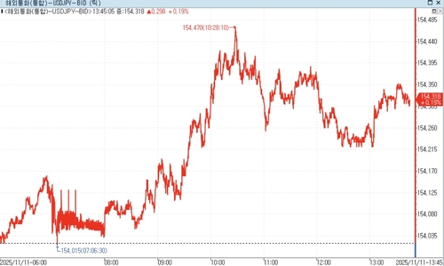 11일 연합인포맥스(화면번호 6411)에 따르면 달러-엔 환율은 오후 1시45분 현재 전일 대비 0.19% 상승한 154.318엔을 기록했다.