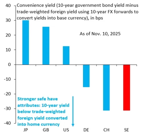 골드만삭스의 수석 외환 전략가를 지낸 로빈 브룩스는 11일(현지시간) 엑스(옛 트위터)에 올린 글에서 "스웨덴의 정부 부채는 국내총생산(GDP)의 33%이고, 스위스는 38%"라면서 "이 두 나라는 세계적 부채 과잉과 통화가치 훼손 거래(debasement trade) 속에서 시장이 몰려드는 새로운 안전 피난처로 떠오르고 있다"고 말했다.