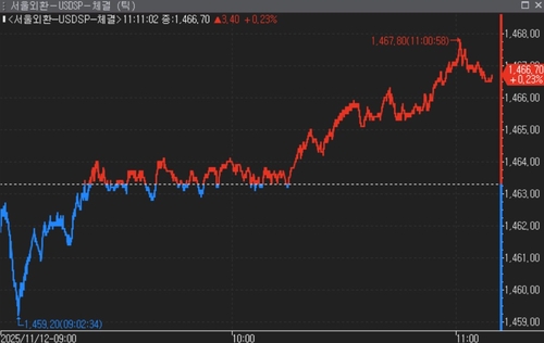 12일 서울 외환시장에서 온라인카지노 아벤카지노원 환율은 오전 11시11분 현재 전장대비 3.40원 높아진 1,466.70원에 거래됐다.
