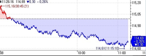 10년 국채선물은 33틱 떨어진 114.66에 거래됐다.