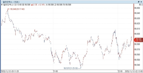 연합인포맥스(화면번호 6411)에 따르면 12일 오전 8시 13분 현재(이하 미 동부시간) 뉴욕 외환시장에서 주요 6개 통화에 대한 달러 가치를 반영하는 달러인덱스(DXY)는 99.583으로 전장 마감 가격(99.453)보다 0.130포인트(0.131%) 올라갔다.