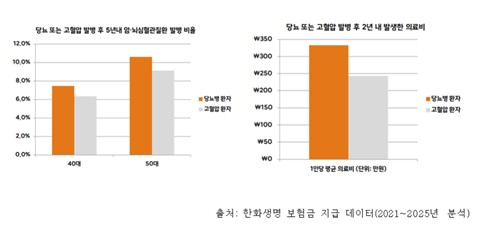 또한, 당뇨 환자는 다른 만성질환에 비해서도 합병증 위험이 전반적으로 더 높게 나타났다. 40대 당뇨 환자의 암·뇌심혈관질환 보험금 청구 비율은 7.4%, 50대는 10.6%로, 같은 연령대의 고혈압 환자보다 높았다.