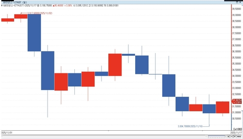 이더리움은 장 중 한때 5% 넘게 낙폭을 확대해 3,004달러를 기록하기도 했다. 이는 지난 7월 이후 최저치다.