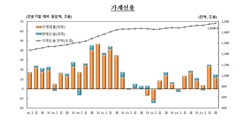 한국은행이 18일 발표한 '2025년 3분기 가계신용(잠정)'에 따르면 9월 말 기준 가계신용 잔액은 1천968조3천억원으로 전분기 말 대비 14조9천억원 늘었다.