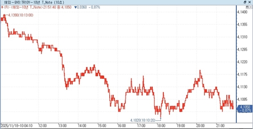 연합인포맥스의 해외금리 일중 화면(화면번호 6532)에 따르면 18일(미국 동부시간) 오전 7시 48분 현재 뉴욕 채권시장에서 10년물 국채금리는 직전 거래일 오후 3시 기준가보다 2.60bp 하락한 4.1060%를 기록했다.