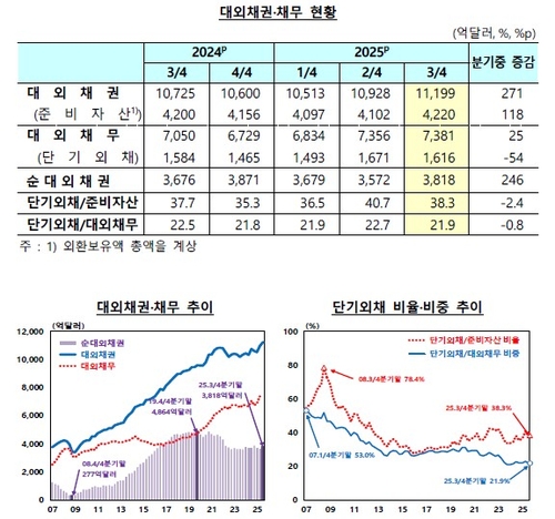 이날 기획재정부가 발표한 '2025년 3온라인카지노 슬롯 대외채권·채무 동향'에 따르면 총외채에서 단기외채가 차지하는 비중은 2온라인카지노 슬롯 22.7%에서 3온라인카지노 슬롯에 21.9%로 하락했다.