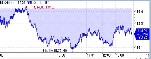 10년 국채선물은 18틱 하락한 114.25였다.