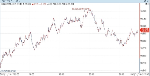 연합인포맥스(화면번호 6411)에 따르면 19일 오전 7시 40분 현재(이하 미 동부시간) 뉴욕 외환시장에서 주요 6개 통화에 대한 달러 가치를 반영하는 달러인덱스(DXY)는 99.716으로 전장 마감 가격(99.588)보다 0.128포인트(0.129%) 올라갔다.