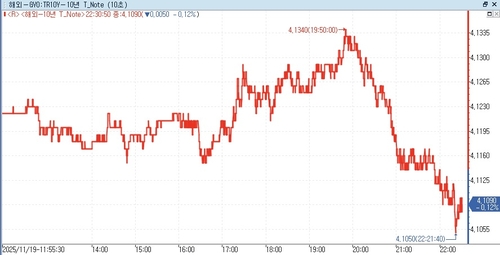 연합인포맥스의 해외금리 일중 화면(화면번호 6532)에 따르면 19일(미국 동부시간) 오전 8시 20분 현재 뉴욕 채권시장에서 10년물 국채금리는 직전 거래일 오후 3시 기준가보다 1.50bp 하락한 4.1060%를 기록했다.