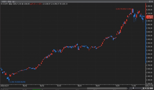지수는 한때 4,059.37까지 고점을 높였으나 오후 들어 차익 실현 매물이 출회되며 상승분을 일부 반납했다.