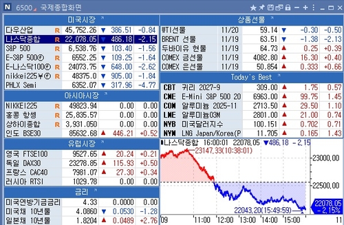 △뉴욕 금융시장에서 주식시장은 3대 지수는 모두 하락 마감. 인공지능(AI) 거품론'이 다시 고개를 들고, 미국 연방준비제도(연준·Fed) 고위 관계자의 금융자산 급락 위험 경고까지 겹치며 기술주 투매 현상이 나타났음.