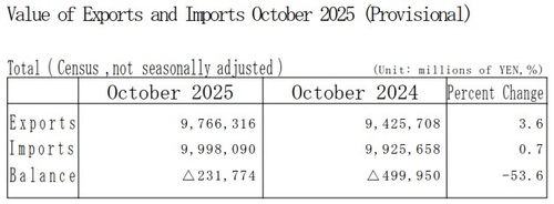 21일 일본 재무성에 따르면 10월 무역수지는 2천317억엔(약 2조1천700억원) 적자로 나타났다.
