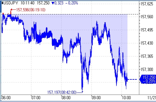 오전 10시 11분 현재 달러-엔 환율은 전장보다 0.20% 밀린 157.25엔에 거래됐다.