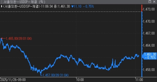 26일 서울 외환시장에서 달러-원 환율은 오전 11시6분 현재 전장대비 11.10원 급락한 1,461.30원에 거래됐다.