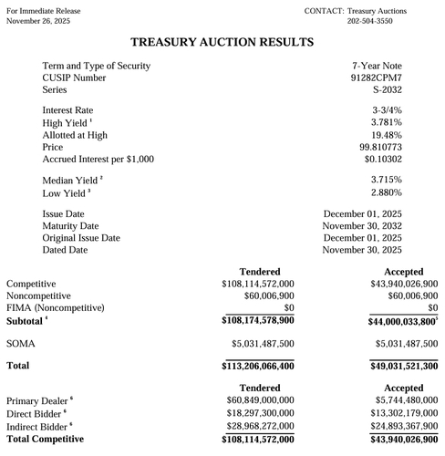 미국 재무부는 26일(현지시간) 오전 11시 반 입찰을 마친 뒤 440억달러 규모 7년물 국채의 발행 수익률이 3.781%로 결정됐다고 발표했다. 지난달 입찰 때의 3.790%에 비해 0.9bp 낮아진 것으로, 작년 9월 이후 최저치다.