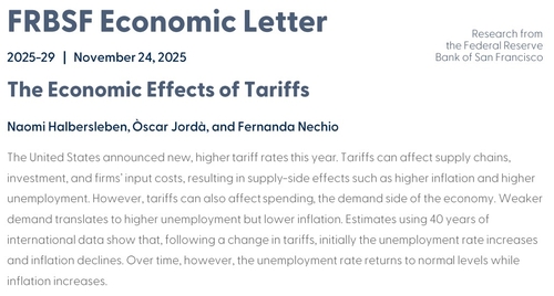 26일(현지시간) 샌프란 연은 경제학자들은 주초 발표한 경제레터에서 40년간의 국제 무역 데이터를 사용해 관세로 인한 경제적 변화를 측정한 결과, 관세가 인플레이션과 실업에 미치는 영향이 시간이 지남에 따라 다르게 나타났다고 밝혔다.