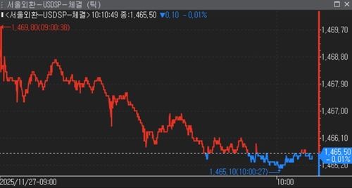27일 서울 외환시장에서 달러-원 환율은 오전 10시10분 현재 전일대비 0.10원 내린 1,465.50원에 거래됐다.