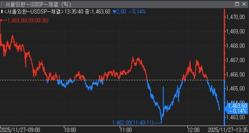 27일 서울 외환시장에 따르면 달러-원 환율은 오후 1시35분 현재 전장대비 2.00원 내린 1,463.60원에 거래됐다.