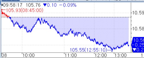 서울 채권시장에 따르면 3년 국채선물은 이날 오후 1시47분 현재 전 거래일 대비 26틱 내린 105.60이었다.