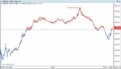 28일 서울 외환시장에서 달러-원 환율은 오전 11시 15분 현재 전장대비 0.20원 오른 1,465.10에 거래됐다.