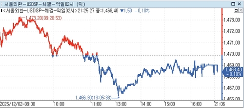 이날 달러-원 환율은 전날보다 1.50원 내린 1,468.40원에 정규장 거래를 마쳤다.