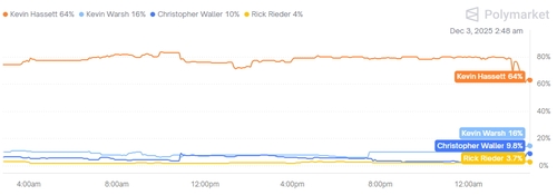 또 다른 베팅사이트인 칼시에서 해싯 위원장이 차기 연준 의장으로 임명될 확률은 60% 중반대를 나타냈다. 트럼프 대통령의 발언에서 80% 초반대에서 하락했다.