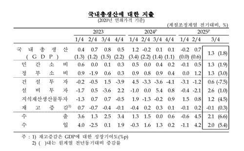 한국은행은 3일 '2025년 3분기 국민소득(잠정)' 자료에서 3분기 실질 GDP가 전기 대비 1.3% 증가했다고 밝혔다.