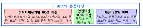 BDC는 자산 총액의 10% 이상을 국공채, 현금성자산, 단기금융상품(CD·MMF) 등 안전자산에 바카라커뮤니티한다. 최소바카라커뮤니티비율 60%와 현금성자산 비율을 제외한 나머지 30%는 현행 공모펀드 운용규제 하에서 자율적으로 운용할 수 있다.