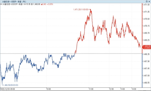 3일 서울 외환시장에서 달러-원 환율은 오후 2시16분 현재 전장대비 0.50원 오른 1,468.80원에 거래됐다.