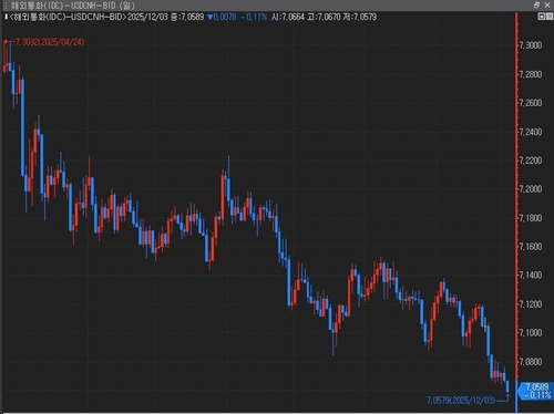 3일 연합인포맥스(화면번호 6412)에 따르면 달러-위안(CNH) 환율은 오후 3시 16분 전일 대비 0.12% 하락한 7.0580위안에 거래되며 연저점을 경신했다.