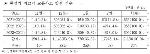삼성화재 교통안전문화연구소는 4일 '동절기 수도권 미끄럼 교통사고 분석 결과' 자료에서 최근 3년간 2천120건의 미끄럼 교통사고가 발생했고 절반 이상이 12월에 집중됐다고 밝혔다.