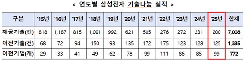 삼성전자는 2015년부터 올해까지 매년 빠짐없이 기술나눔에 참여해 왔다. 누적 제공 기술은 7천8건이었고, 이 중 1천335건의 특허를 772개 기업에 무상으로 이전했다. 기술나눔 참여 기업 중 가장 우수한 실적이다.