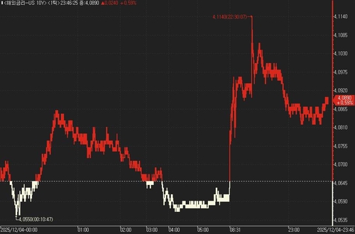 연합인포맥스의 해외금리 일중 화면(화면번호 6532)에 따르면 4일(미국 동부시간) 오전 9시 7분 현재 뉴욕 채권시장에서 10년물 국채금리는 직전 거래일 오후 3시 기준가보다 2.90bp 오른 4.086%를 기록했다.