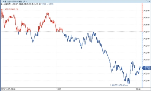 5일 서울 외환시장에 따르면 달러-원 환율은 오전 11시 8분 현재 전장대비 2.40원 내린 1,471.10원에 거래됐다.