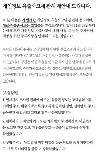 쿠팡은 안내문에서 "본 내용은 기 발생한 개인정보 유출사고와 관련한 공지이며 새로운 유출사고는 없었음을 말씀드린다"면서 "앞서 11월 29일부터 안내해 드린 개인정보 유출사고에 대해 사칭, 피싱 등 추가 피해 예방을 위한 주의사항을 안내해 드리는 것"이라고 설명했다.