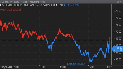 8일 외환시장에서 달러-원 환율은 오후 5시48분 현재 전장 대비 1.30원 하락한 1,467.50원에 거래됐다.