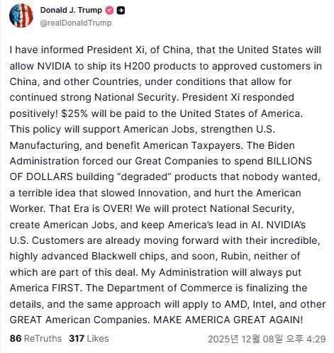 트럼프 대통령은 "나의 행정부는 언제나 미국을 최우선으로 둘 것"이라며 "상무부는 세부 사항을 마무리하는 중이며, 동일한 접근 방식이 AMD와 인텔, 그리고 다른 위대한 기업들에 적용될 것"이라고 했다.