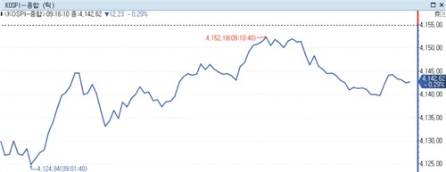 9일 금융시장에 따르면 코스피는 오전 9시 13분 현재 전장보다 10.46포인트(0.25%) 하락한 4,144.39에 거래됐다.
