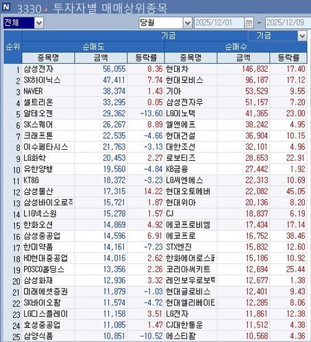 이달 연기금이 가장 많이 담은 종목은 현대차다. 전체 코스피 순매수 금액보다 많은 1천468억 원어치를 사들였다. 다음으로 현대차의 실질적인 지배회사인 현대모비스도 962억 원어치 순매수했다.