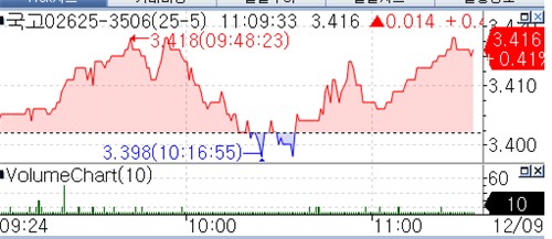 한국은행의 단순매입 발표에도 외국인 매도세 등으로 국고채 3년물은 3.0%대, 10년물은 3.4%대에서 움직임을 이어가고 있다.