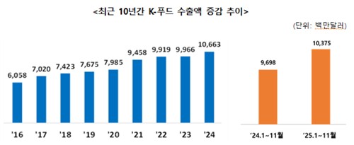 (세종=연합인포맥스) 최욱 기자 = 올해 11월까지 K-푸드 수출액이 103억달러를 돌파하며 연간 최대 실적에 바짝 다가섰다.