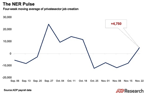 넬라 리처드슨 ADP 수석 이코노미스트는 "4주 연속 감소세를 나타내다가 플러스 전환했다"면서 "이는 노동시장 반등을 시사한다"고 말했다.