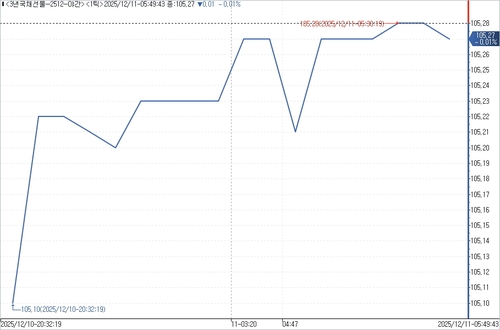 11일 서울채권시장에 따르면 3년 국채선물은 야간 거래에서 전일 주간 거래 종가 대비 10틱 오른 105.28에 마감됐다. 외국인은 113계약 순매수했고, 금융투자와 개인은 각각 29계약 및 83계약 순매도했다.